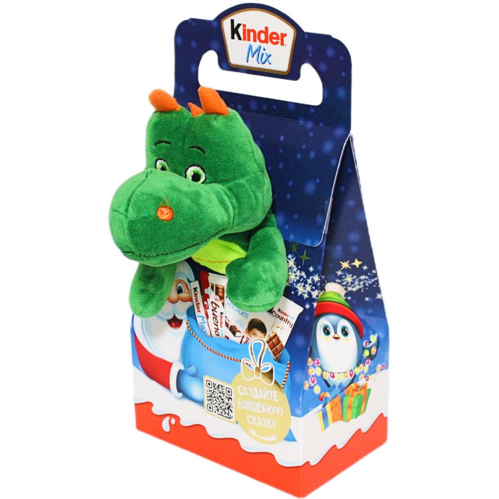 Оригинальная мягкая упаковка в виде символа года с лучшим набором сладостей и шоколадом от Киндер очень понравится ребенку.