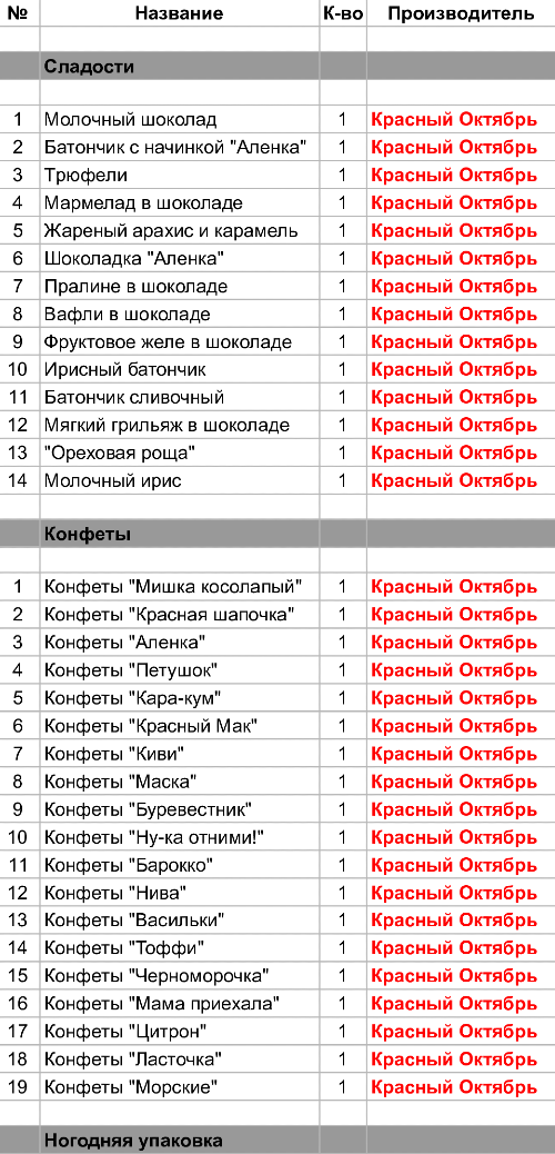 Молочный шоколад (1 шт), Батончик с начинкой "Аленка" (1 шт), Трюфели (1 шт), Мармелад в шоколаде (1 шт), Жареный арахис и карамель (1 шт), Шоколадка "Аленка" (1 шт) ,Пралине в шоколаде (1 шт), Вафли в шоколаде (1 шт), Фруктовое желе в шоколаде (1 шт), Ирисный батончик (1 шт), Батончик сливочный (1 шт), Мягкий грильяж в шоколаде (1 шт), "Ореховая роща" (1 шт), Молочный ирис (1 шт), Конфеты "Мишка косолапый" (1 шт), Конфеты "Красная шапочка" (1 шт) ,Конфеты "Аленка" (1 шт), Конфеты "Петушок" (1 шт), Конфеты "Кара-кум" (1 шт), Конфеты "Красный Мак" (1 шт), Конфеты "Киви" (1 шт), Конфеты "Маска" (1 шт), Конфеты "Буревестник" (1 шт), Конфеты "Ну-ка отними!" (1 шт), Конфеты "Барокко" (1 шт), Конфеты "Нива" (1 шт), Конфеты "Васильки" (1 шт), Конфеты "Тоффи" (1 шт), Конфеты "Черноморочка" (1 шт), Конфеты "Мама приехала" (1 шт), Конфеты "Цитрон" (1 шт), Конфеты "Ласточка" (1 шт), Конфеты "Морские" (1 шт)