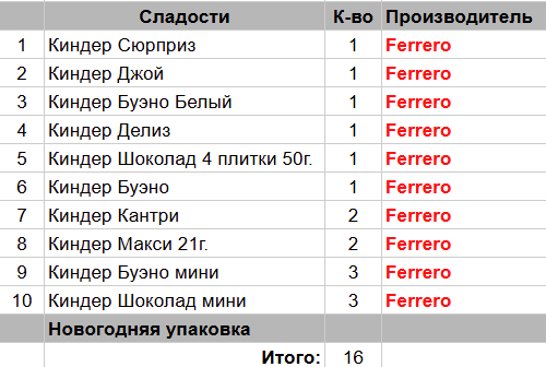 Киндер Сюрприз (1 шт), Киндер Джой (1 шт), Киндер Буено Белый (1 шт), Киндер Делиз (1 шт), Киндер Шоколад 4 плитки 50 гр. (1 шт), Киндер Буено (1 шт), Киндер Кантри (2 шт), Киндер Макси 21г. (2 шт), Киндер Буено мини (3 шт), Киндер Шоколад мини (3 шт)